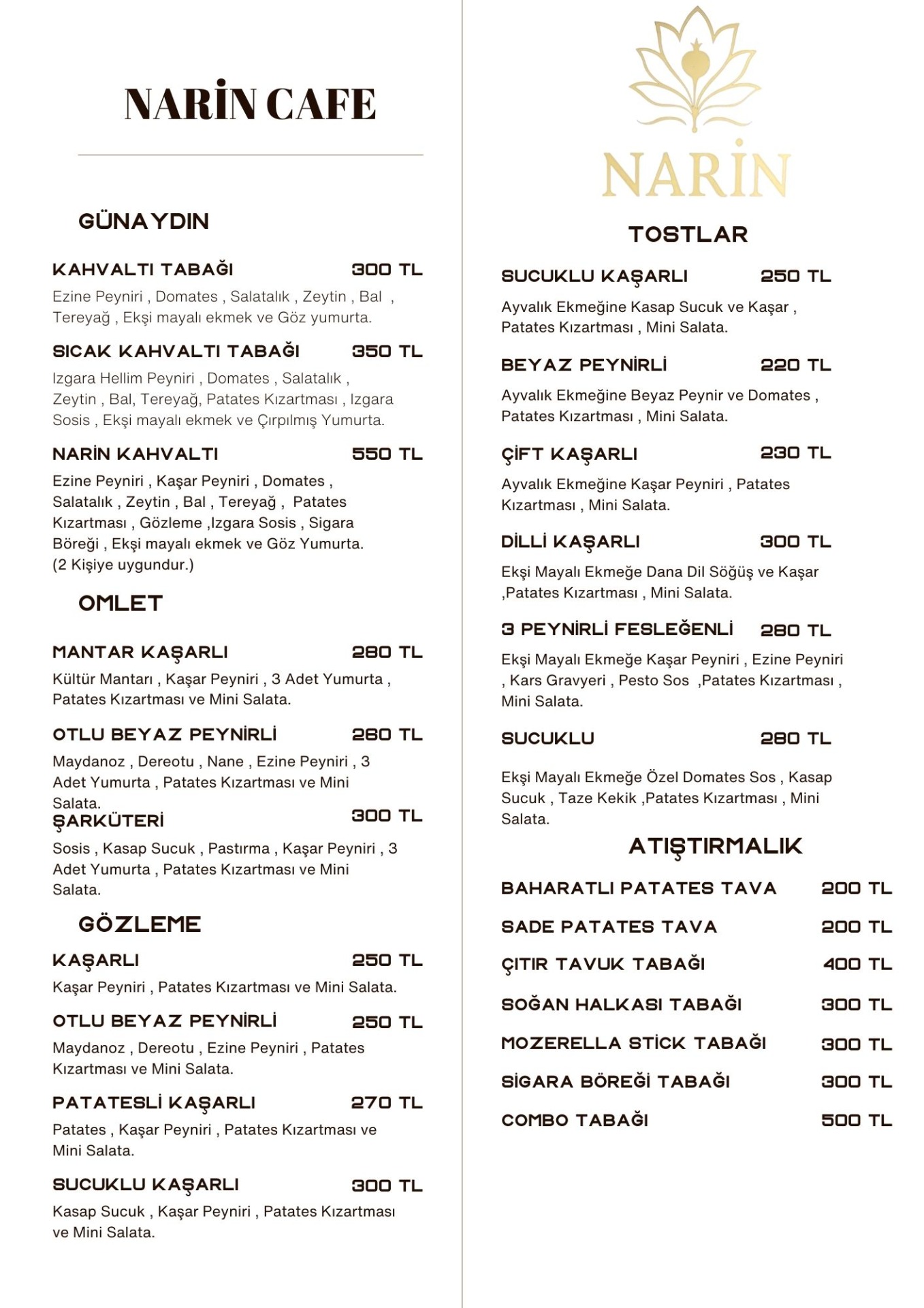 Narin Cafe olarak, lezzetli yemeklerimizle sizi ağırlamaktan ve keyifli bir yeme deneyimi sunmaktan mutluluk duyuyoruz. Müşterilerimizin memnuniyeti ve mutluluğu bizim için her zaman en önemli önceliktir.